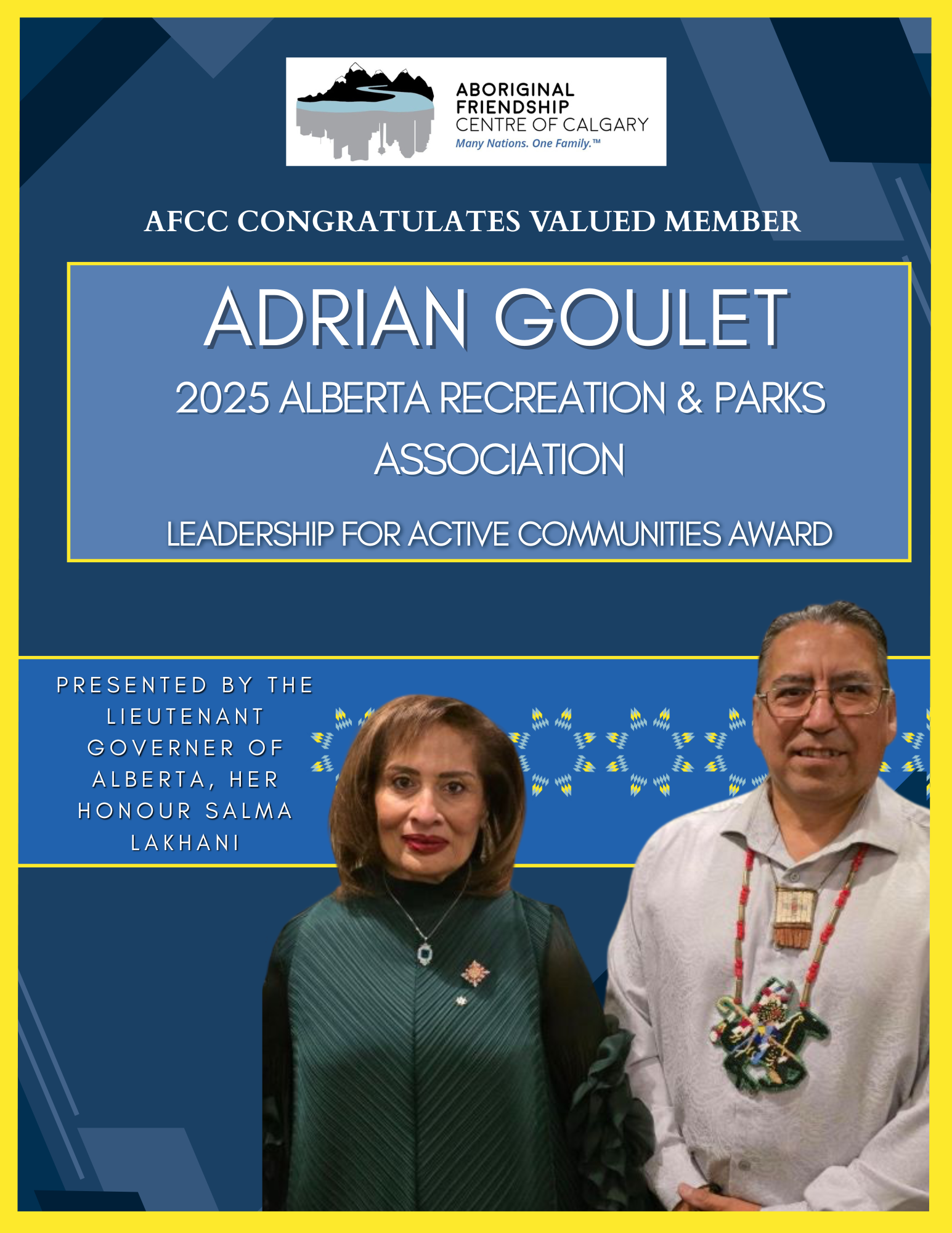The Aboriginal Friendship Centre of Calgary (AFCC) is incredibly proud and honoured to congratulate our valued colleague, Adrian Goulet, recipient of the prestigious 2025 Alberta Recreation & Parks Association (ARPA) Leadership for Active Communities Award. This award was presented by the Lieutenant Governor of Alberta, Her Honour Salma Lakhani.