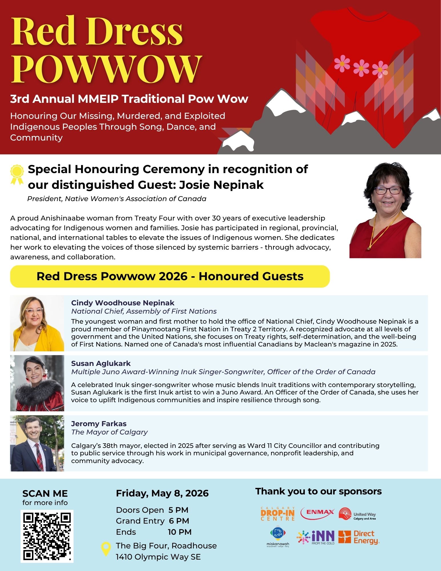 We are incredibly proud to welcome a wonderful group of Elders, dignitaries, and special guests to this year’s Red Dress Powwow. Their presence brings wisdom, strength, and guidance to our gathering. Click below to see the list of honoured guests who will be joining us and walking alongside the community for this special day.