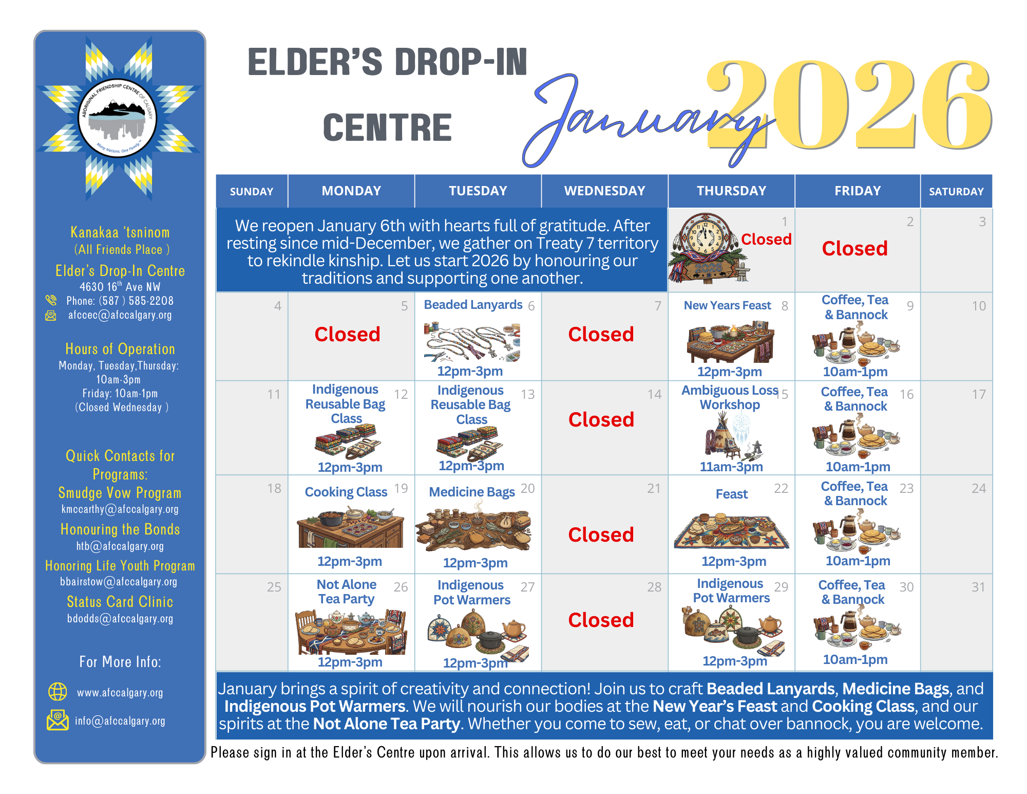 After resting and recharging since mid-December, our doors reopen on Tuesday, January 6th with hearts full of gratitude. We gather once again on Treaty 7 territory to rekindle kinship, honour our traditions, and support one another as we step into 2026.